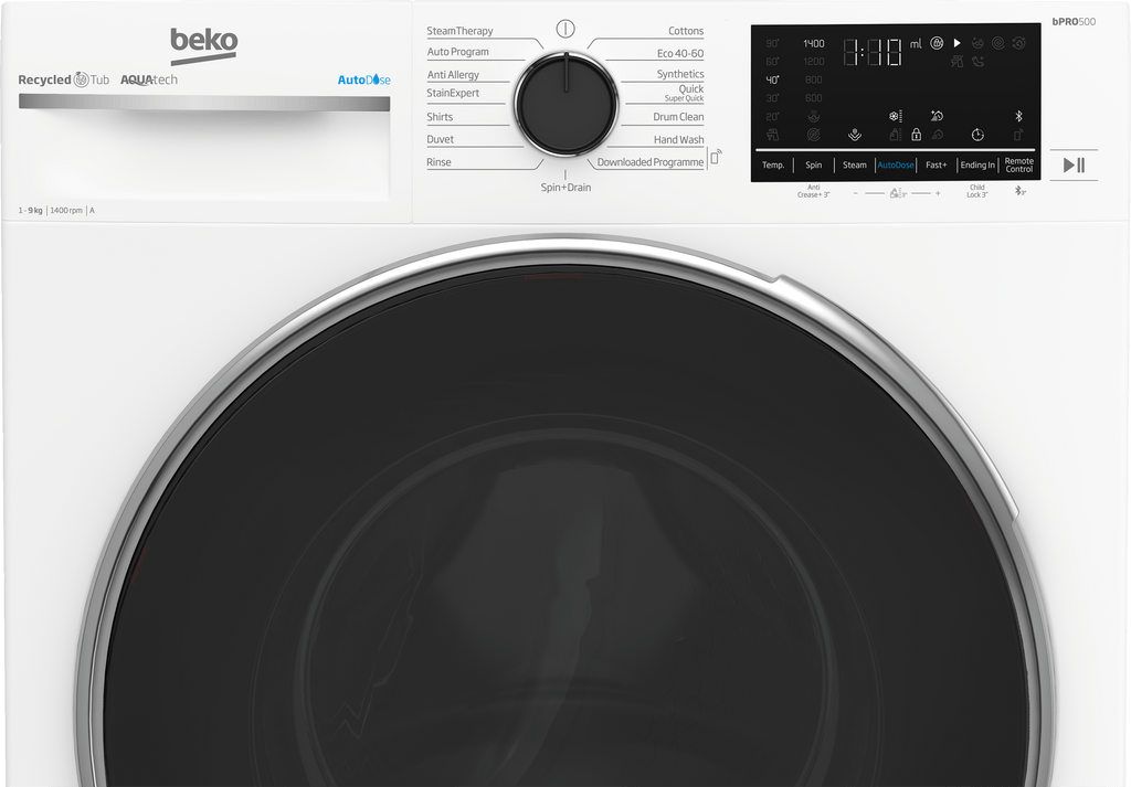 Recycled plastic bottles are used in the production of Beko RecycledTub® machine tubs, accounting for up to 10% of the materials used in each tub. By transforming recycled plastic bottles into high-performance materials, Beko is taking small steps to reduce the embedded carbon footprint of the product, whilst also minimising the use of virgin plastic.